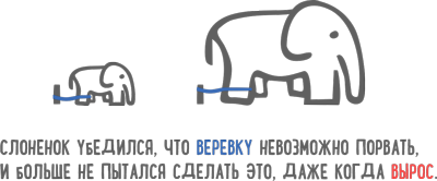 Давно известный факт, что для того, чтобы слон служил человеку, его еще маленьким приручают… к веревке. Как? Маленького слоненка привязывают к толстому дереву на прочную веревку. Слоненку, конечно же, это не нравится. Он долго пробует все свои силы, чтобы освободится, вырваться, избавиться от веревки. Но он еще очень мал, и веревка оказывается сильнее его настойчивых усилий. На удивление, животное довольно быстро привыкает к тому, что… веревка сильнее его. Проходит время. Слоненок вырастает. Теперь это большой, могучий слон. Теперь, казалось бы, его ничто не сможет удержать. Никакая веревка не властна над ним. Но… его привязывают все той же веревкой. И слон — больше не проверяет веревку на прочность.