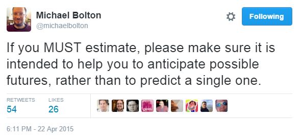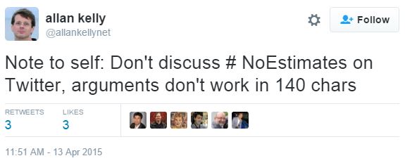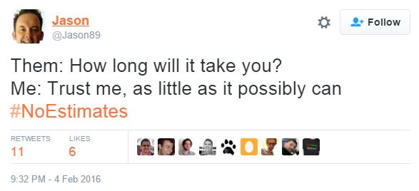 «Помните, что #NoEstimates — это не про то, чтобы не делать оценку. Это про то, чтобы делать ее как можно меньше. А потом, внимательно присмотреться и уменьшить эту потребность еще больше»