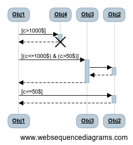 а текст изменится на: Если же сумма превышает $50, но не превышает $1000, то управление передается объекту 3,