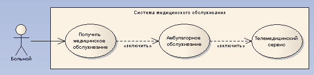 Контекст телемедицинской системы сначала просто выражается ассоциацией главного действующего лица, «Больной», с единственным интересующим его вариантом использования (ВИ) более общей системы – «Получить медицинское обслуживание», обозначенным на диаграмме императивно, как требование. ВИ включает вариант «Амбулаторное обслуживание», который содержит ВИ «Телемедицинский сервис».