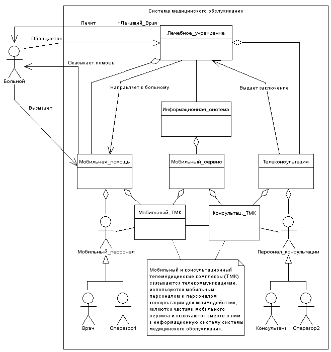 Телемедицинский контекст также можно представить в виде структуры системы. Каждый больной имеет или не имеет возможность обращаться за медицинской помощью в какое-либо лечебное учреждение. Также каждый из них может или не может вызывать мобильную медицинскую помощь. Больных могут лечить врачи лечебных учреждений, а персонал мобильных служб лишь оказывает помощь. Консультанты дистанционно взаимодействуют с мобильными службами - получают от них данные клинико-функциональных исследований больных, интерпретируют данные  и консультируют мобильный персонал. Свои заключения по результатам исследований консультанты отправляют лечащим врачам в лечебные учреждения. Каждая мобильная служба или телеконсультация по отдельности могут быть агрегированы с одним или многими лечебными учреждениями, или ни с одним из них. Для пооддержки мобильных служб все телеконсультации связаны с информационной системой, но это не обязательно для мобильных служб, если они не взаимодействуют с телеконсультациями.